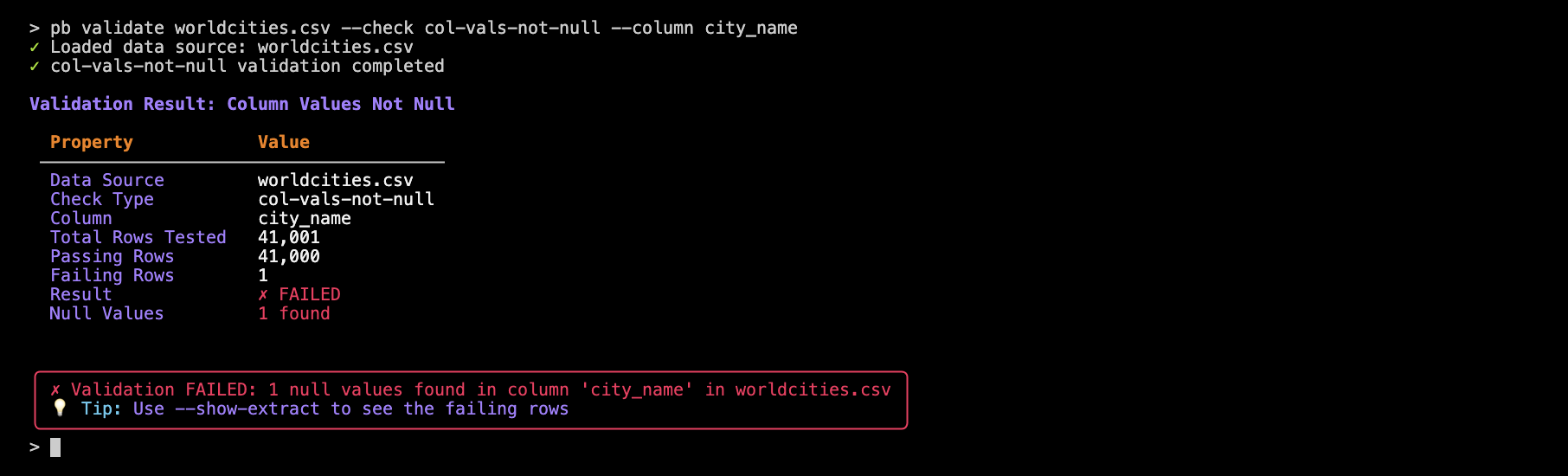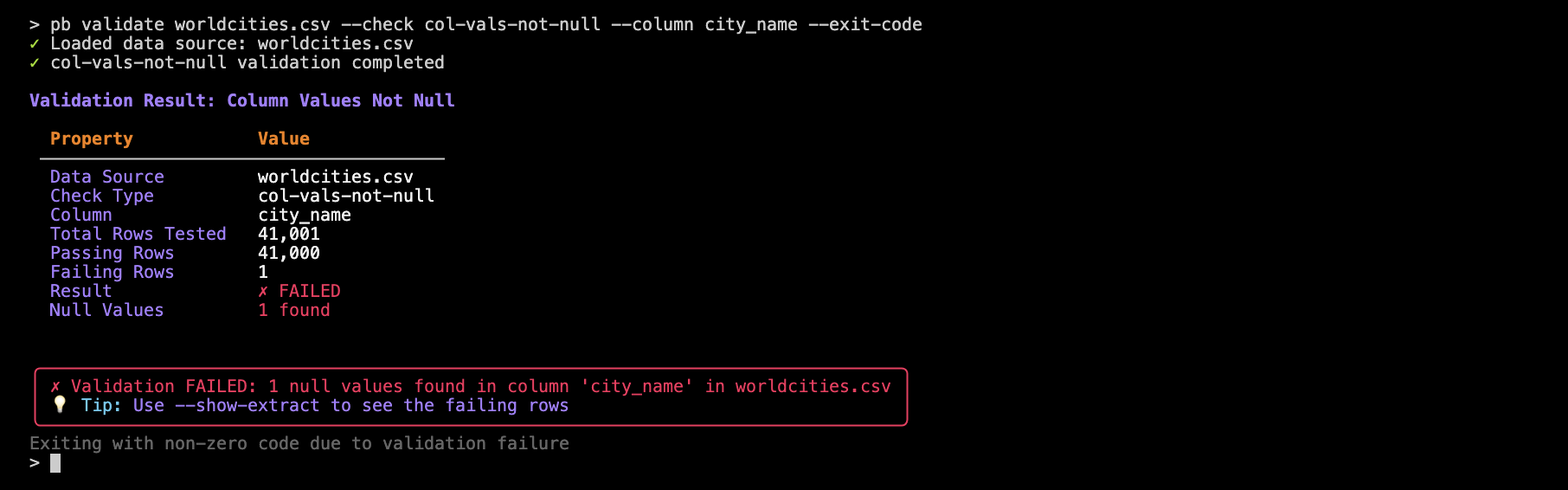 pb validate worldcities.csv --check col-vals-not-null --column city_name --exit-code