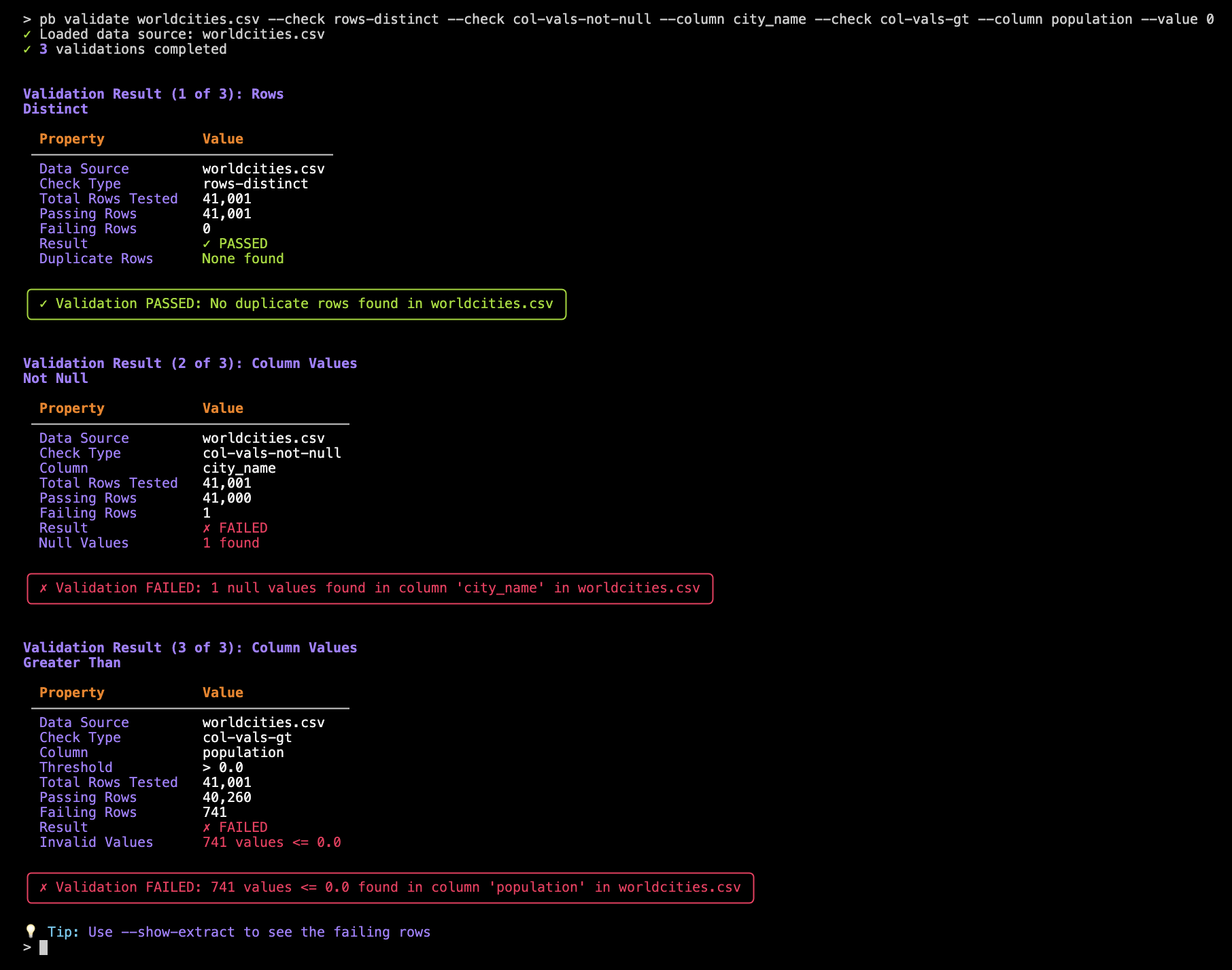 pb validate worldcities.csv --check rows-distinct --check col-vals-not-null --column city_name --check col-vals-gt --column population --value 0