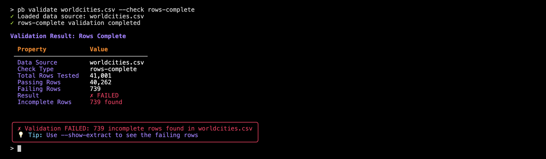 pb validate worldcities.csv --check rows-complete --show-extract