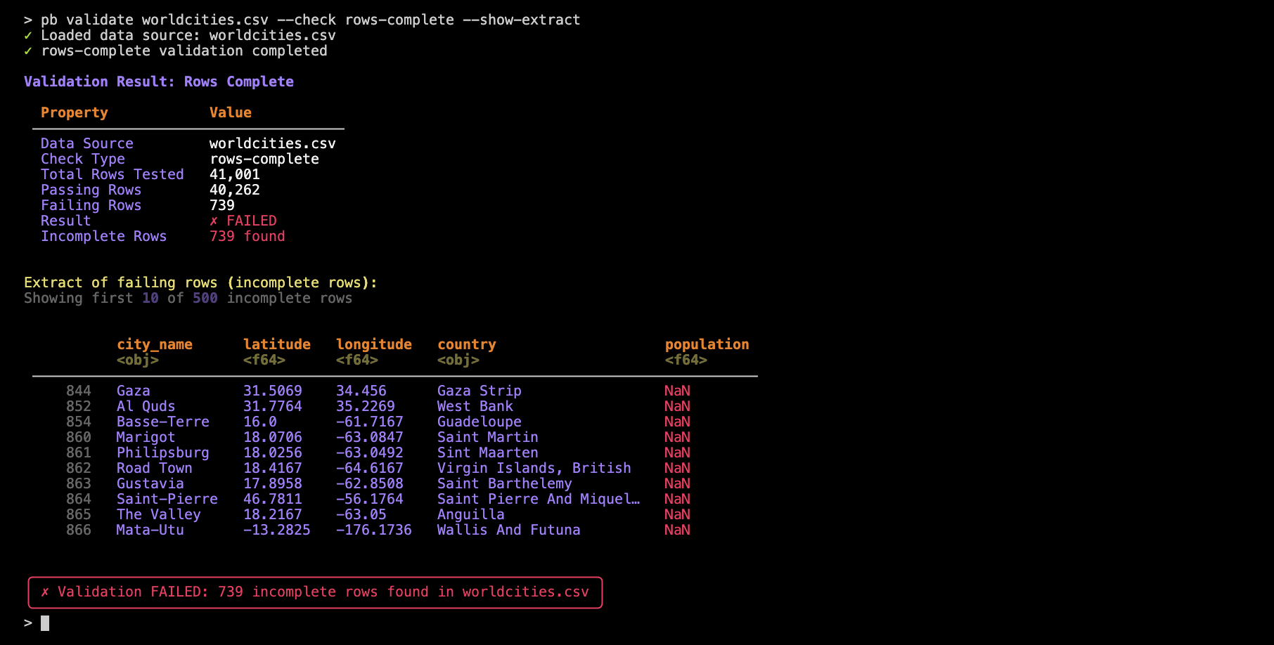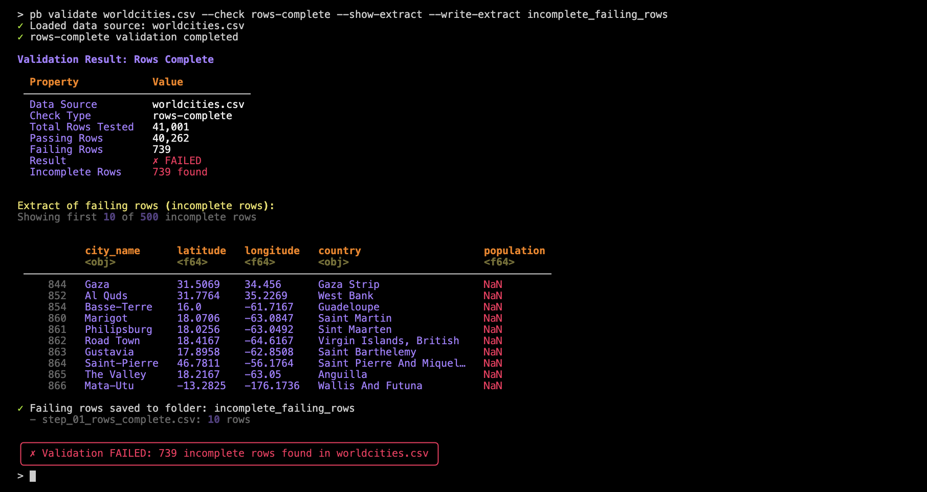 pb validate worldcities.csv --check rows-complete --show-extract --write-extract incomplete_failing_rows
