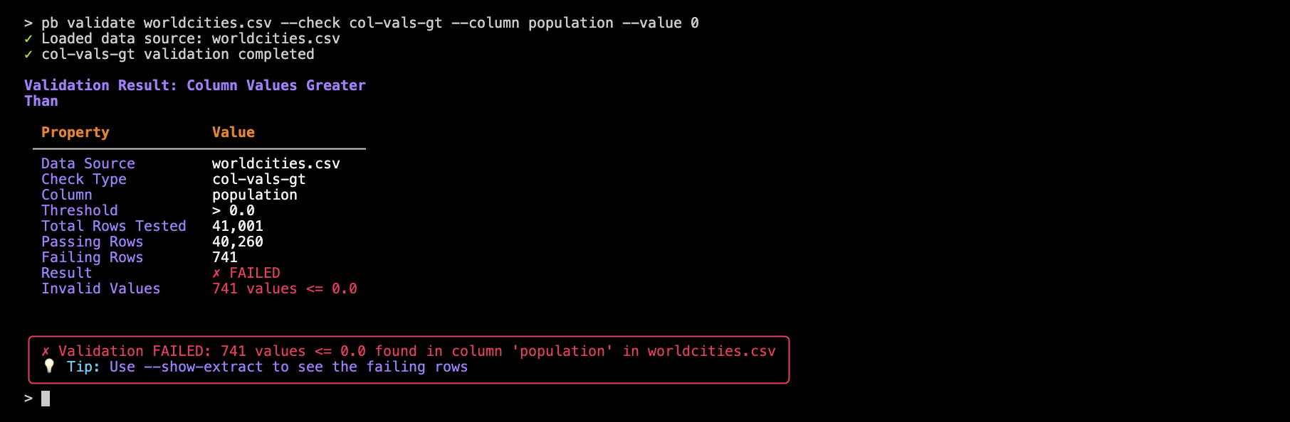 pb validate worldcities.csv --check col-vals-gt --column population --value 0
